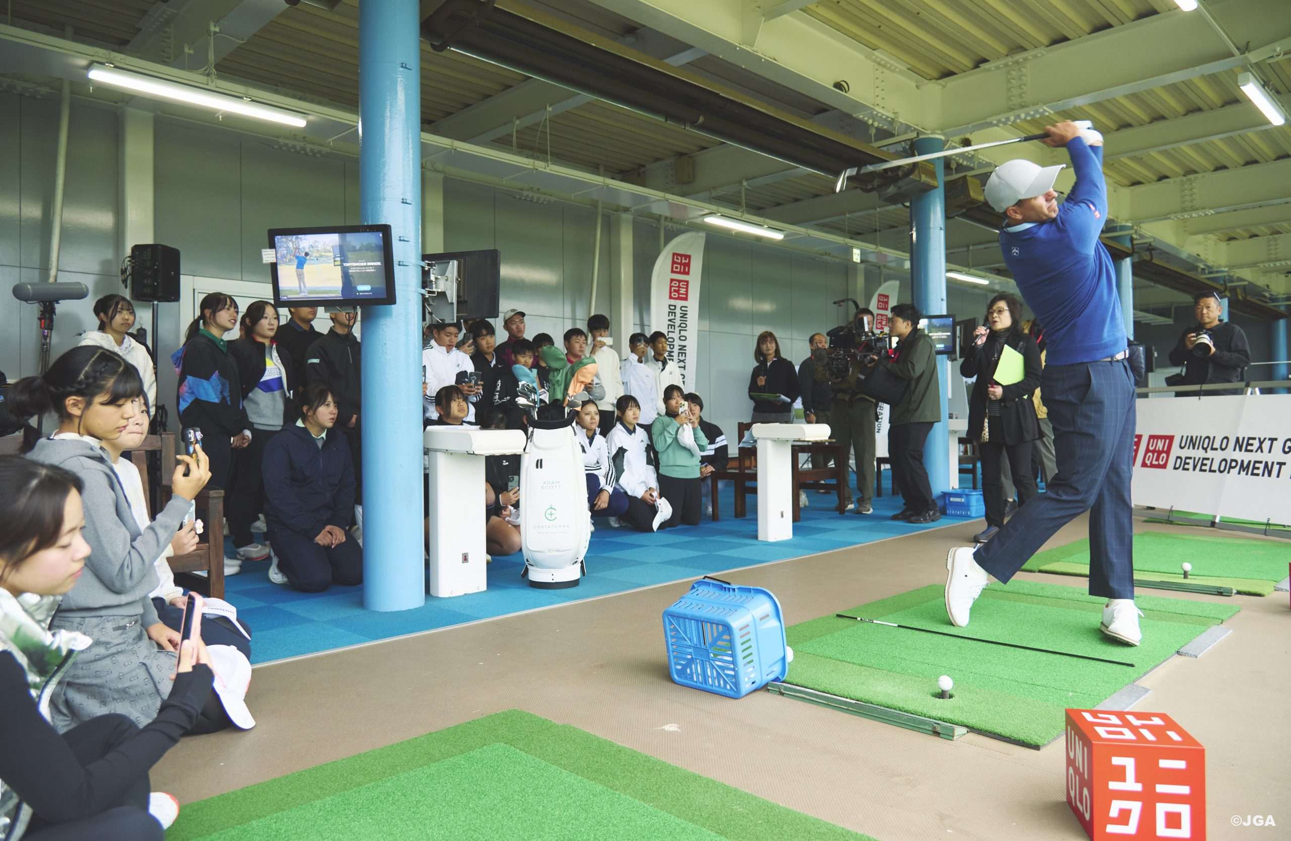 生憎の雨となったために、屋内打撃練習場での開催となった本セミナーでしたが、アダム・スコット選手がウォーミングアップ方法の紹介から参加者たちのリクエストに応じてショットを披露したほか、一人ひとりのレベルに合わせて熱心にレッスンを実施するなど、交流を深めました。アダム・スコット選手からは「今日は、短い時間でしたが、何かを掴み、学んでくれたら嬉しいです。これからもがんばってください」とセミナーに参加したジュニアゴルファーにエールを送るとともに、「日本の次世代育成強化も前に進んでいっていると思う。このイベントでジュニア選手たちとゴルフをすると、彼らの情熱や思いに触れることが出来るので、自分自身にとっても良い経験になっています」と本セミナーの意義を話していただきました。