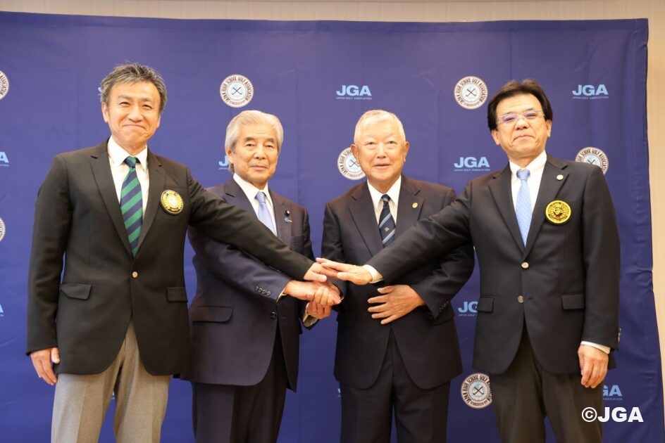 公益財団法人日本ゴルフ協会と(JGA)一般社団法人日本高等学校・中学校ゴルフ連盟(高ゴ連)は6月5日、2025年度から日本ジュニアゴルフ選手権を共催することを決定し、都内ホテルで記者発表会を開催しました。今回の決定により、日本高等学校・中学校ゴルフ連盟が主催する全国高等学校・中学校ゴルフ選手権(緑の甲子園)は日本一の高校・中学ゴルフ部を決める団体戦、日本ジュニアは日本一のジュニアゴルファーの座を争う個人戦として2025年大会は本選手権創設からの通算回数となる第69回大会として開催することを発表しました。