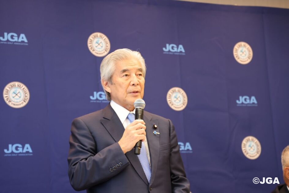 続いて中曽根弘文高ゴ連会長より、「両団体が日本ジュニアゴルフ選手権を共催できることに格別の意義を感じています。JGAが新たな目標としているゴルフの普及と振興の意味において、ジュニア育成が最優先課題であり、今回の決定は、それに大きく貢献するものと思っています。日本ジュニアが名実ともに中高生が目指す最高峰の競技となるように我々も協力していきたいと思います」と本決定の意義を語りました。さらに、緑の甲子園については、「高校生の部は現在の形を踏襲する形で学校対抗、全国的に部活動が縮小傾向にある中学の部は、協力団体のジュニアゴルフクラブチーム連盟によるクラブチームとの連携を模索していくものと思っています」と来年からの展望を発表しました。